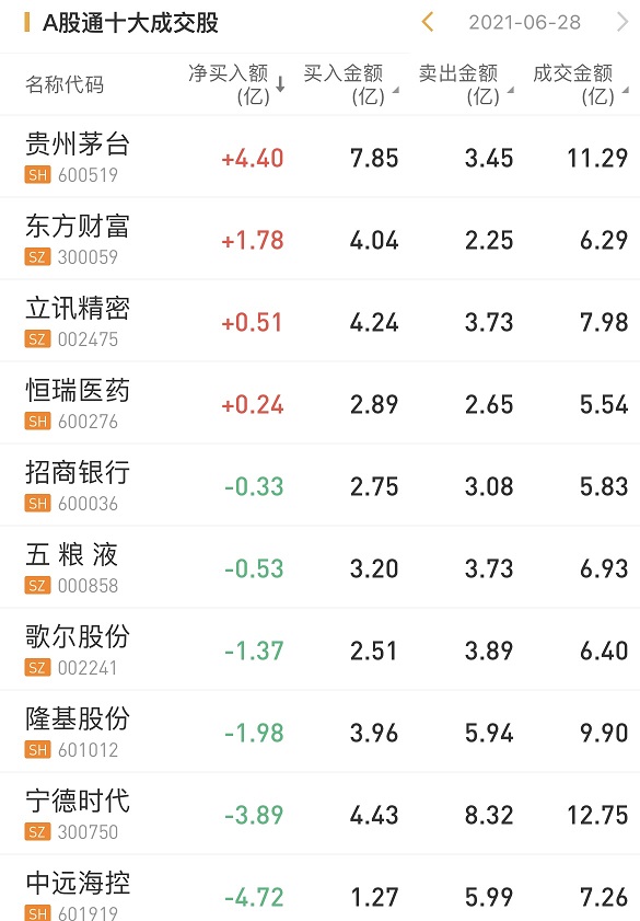 北上资金今日净买入贵州茅台4.40亿元,为今日买入之最。