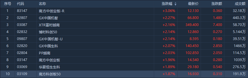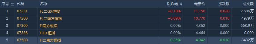 受消息影响,今日港股涨幅居前的ETF有GX两倍看多恒指(07231.HK),收涨0.18%,成交2.686万港元;南方两倍看多恒指(07200.HK)收涨0.09%,成交额达4979万港元。