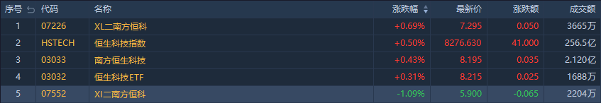 看多恒指相关ETF走强,南方两倍做多恒科(07226.HK)涨0.69%,成交额约3665万港元;
