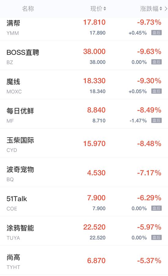 满帮跌近10%,BOSS直聘跌超9%,每日优鲜跌超8%,波奇宠物跌超7%,51Talk跌超6%,涂鸦智能跌近6%,陆金所跌4.8%,水滴跌3%,斗鱼、拼多多跌2%,京东、爱奇艺跌超1%。