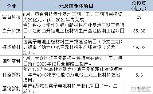 2021年以来,包括容百科技、当升科技、振华新材、科隆新能、厦钨新能等三元正极材料企业扩产规划、项目开工均提上日程,项目总投资合计近108亿元。