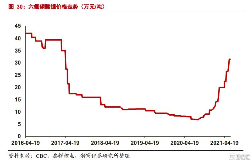 电解液的核心材料六氟磷酸锂(六氟),占电解液成本比重高达50%,自去年三季度后价格一路飙涨,报价从底部8万元/吨升至35万元/吨,创下近4年新高,涨价速度就跟坐火箭一样。