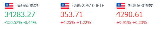 道指跌150.57点,或0.44%,报34283.27点;纳指涨140.12点,或0.98%,报14500.51点;标普500指数涨9.91点,或0.23%,报4290.61点。