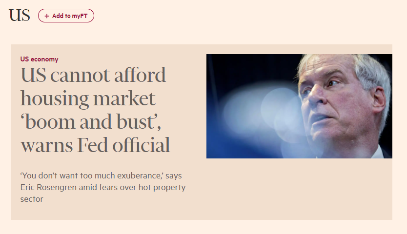 美联储一名高级官员警告称,美国无法承受可能威胁金融稳定的房地产市场“繁荣与萧条周期”,这表明美联储对房价上涨的担忧日益加剧。波士顿联储主席埃里克·罗森格伦 (Eric Rosengren) 对英国《金融时报》表示:“对我们来说,回到 2% 的通胀目标非常重要,但目标是使其可持续。” 根据全美房地产经纪人协会上周公布的数据,5 月份现房销售中位数价格同比上涨 23.6%,首次突破 35 万美元。