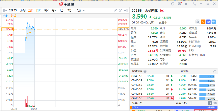 森松国际(02155.HK)挂牌第二天,获利盘涌现高位急速回调。截至发稿,跌3.48%,报8.59港元,成交8140万港元。