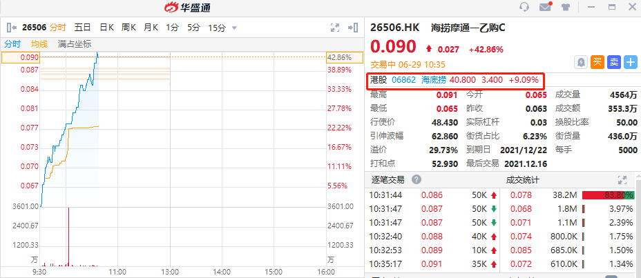 相关涡轮方面,海捞摩通一乙购C涨42.86%,其行使价为48.43港元,到期日为2021年12月22日,溢价29.73%。