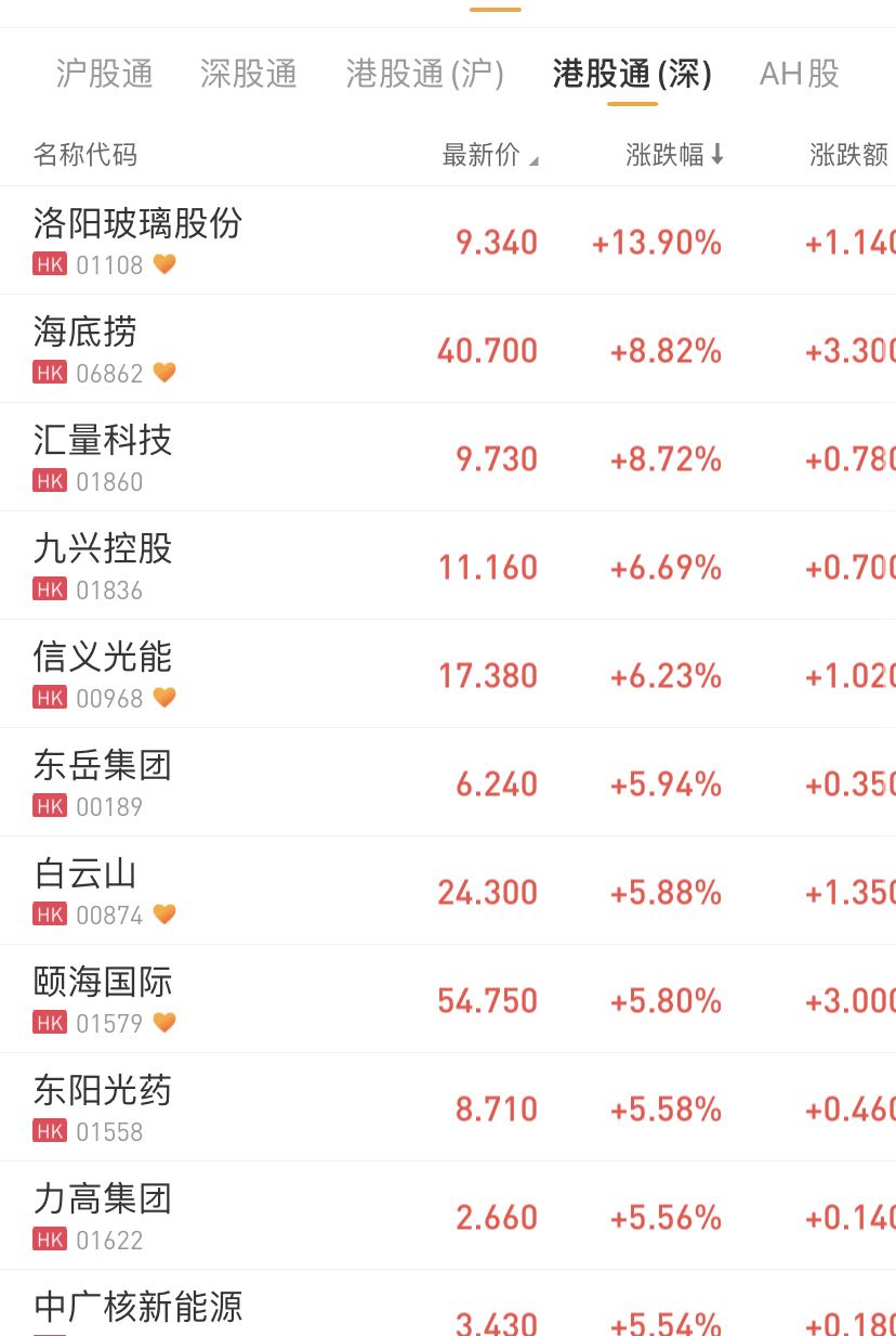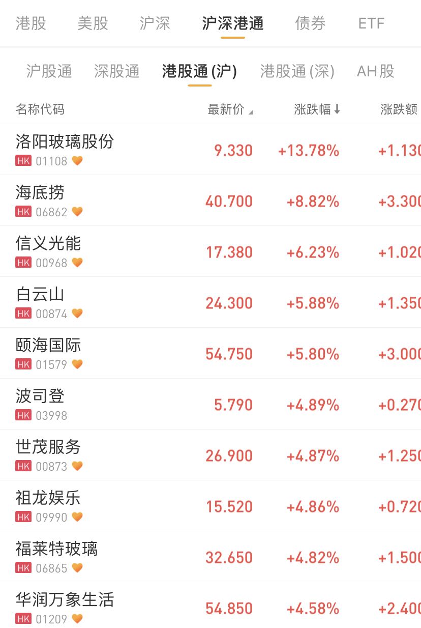 港股通(沪)、港股通(深)个股方面,洛阳玻璃股份涨13%,汇量科技、海底捞涨8%,信义光能涨6%。