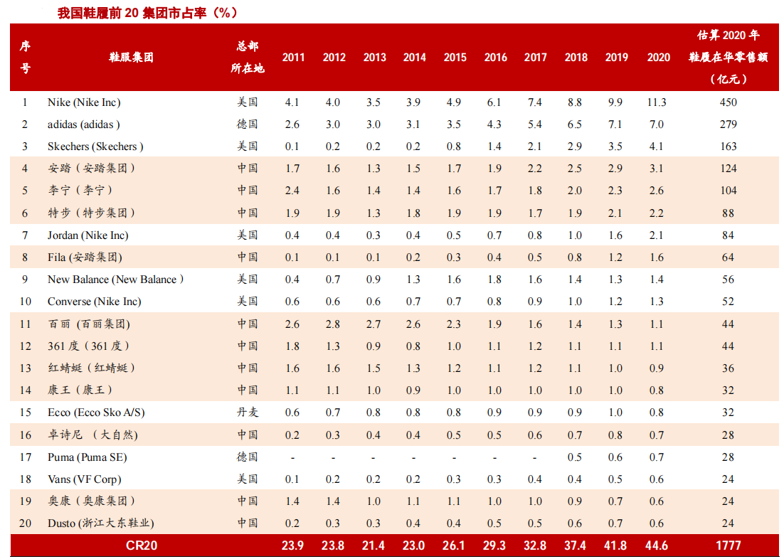 中国鞋履CR20(前二十名品牌市场占有率)从2011年的24%快速提升至20年的45%,海外头部运动品牌集中化明显。
