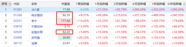 而观察估值指标,特步国际、安踏体育以及李宁的市盈率分别高达62倍、82倍以及117倍。