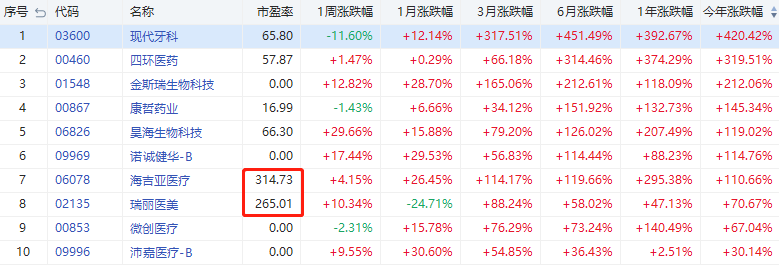 而观察估值指标,金斯瑞生物科技、诺诚建华、沛嘉医疗由于未盈利无法用市盈率估值,而海吉亚医疗、瑞丽医美两股的市盈率更是高达314倍和265倍。