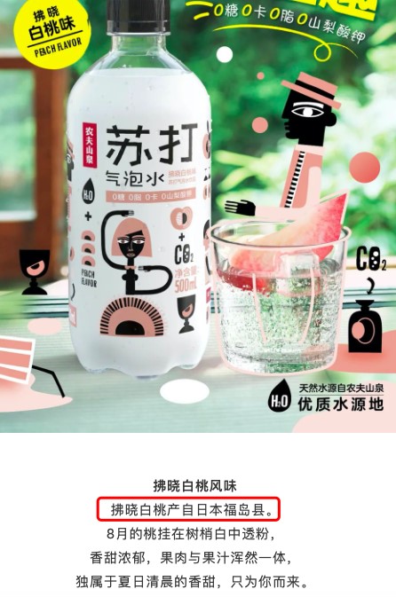 最近农夫山泉的“拂晓白桃味苏打气泡水”被传地沸沸扬扬,主要是其外包装的宣传中的“原料产自日本福岛”引发了网友的热议。