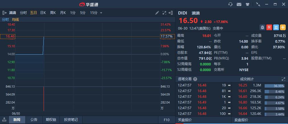 华盛资讯7月1日消息,中国领先的共享出行平台滴滴出行公司(DIDI)正式登陆纽交所。