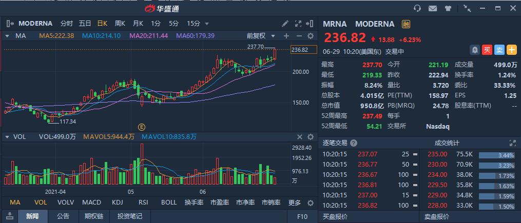 此前,Argus分析师Jasper Hellweg发表报告表示,将Moderna目标价由200美元上调至230美元,维持“买入”评级。Hellweg援引Moderna的说法表示,该公司正在考虑开发新冠疫苗加强针,同时还向相关机构申请在青少年使用该公司疫苗,将其覆盖范围扩大到新的人群中。不过,Hellweg补充道,由于新冠疫苗或其他管线产品的任何意外负面发展都将导致该股大跌,因此该分析师认为Moderna只适合风险承受能力强的投资者。