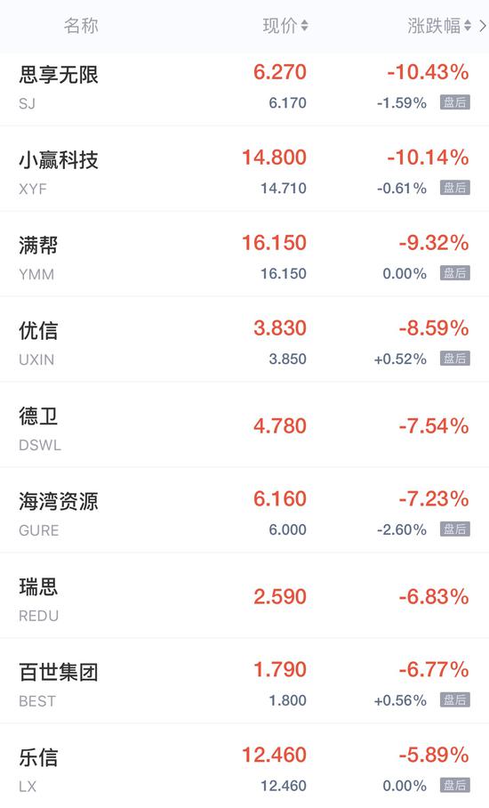 小赢科技跌超10%,满帮跌超9%,优信跌超8%,百世集团跌超6%,迅雷、欢聚集团跌超3%,趣头条、猎豹移动、亿邦国际跌超2%,陌陌、网易有道、哔哩哔哩、搜狐跌超1%。