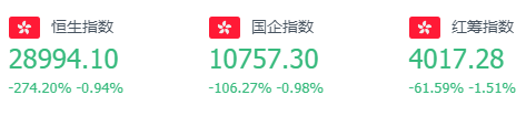 周二(6月29日),截至收盘,恒生指数跌274.2点或0.94%,报28994.1点,全日成交额达1461.26亿。国企指数跌0.98%,报10757.3点,红筹指数跌1.51%,报4017.28点。