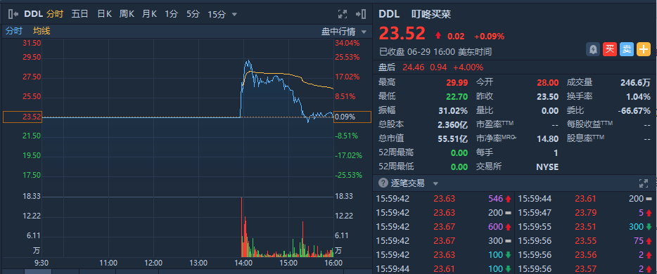 叮咚买菜周二正式登陆纽交所,股票代码为“DDL”,发行价为23.5美元。该股开盘价为28美元,较发行价上涨19.1%,盘中涨幅一度超过25%,股价最高至29.99美元,但午后股价一路下挫,一度跌破发行价。截至收盘,该公司股价报23.52美元,涨幅0.09%,市值55亿美元。