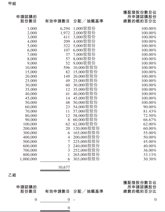 公开发售一手中签率为100%,所有档位的申购均能中签,无人打新乙组。