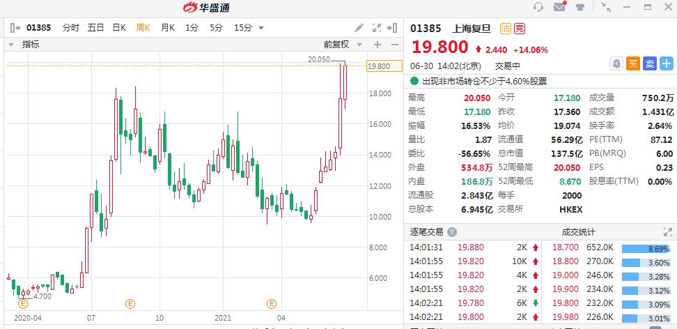 华盛资讯6月30日消息,芯片概念股上海复旦午后持续走高,一度涨破15%刷新历史新高。截至发稿,上海复旦涨14.06%,报19.8港元,暂成交1.431亿港元,最新总市值137.5亿港元。