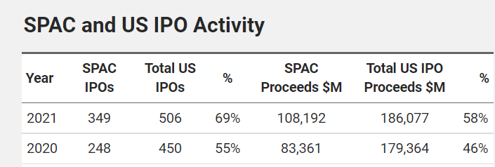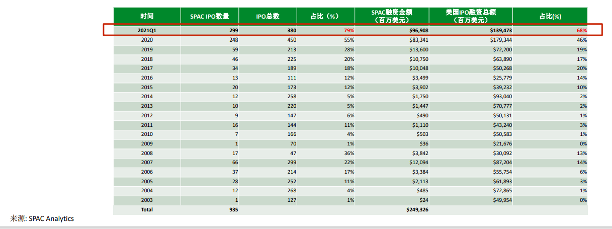 2021年第一季度,SPAC大约占IPO市场总数的79%,从299笔交易中筹集969.1亿美元,占IPO总数的68%。