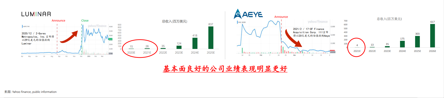 可以清晰地看到,基本面更好的LUMINAR,合并完成后股价成倍增长;而基本面相对一般的AEYE,在宣布标的之后,股价即大幅下挫。