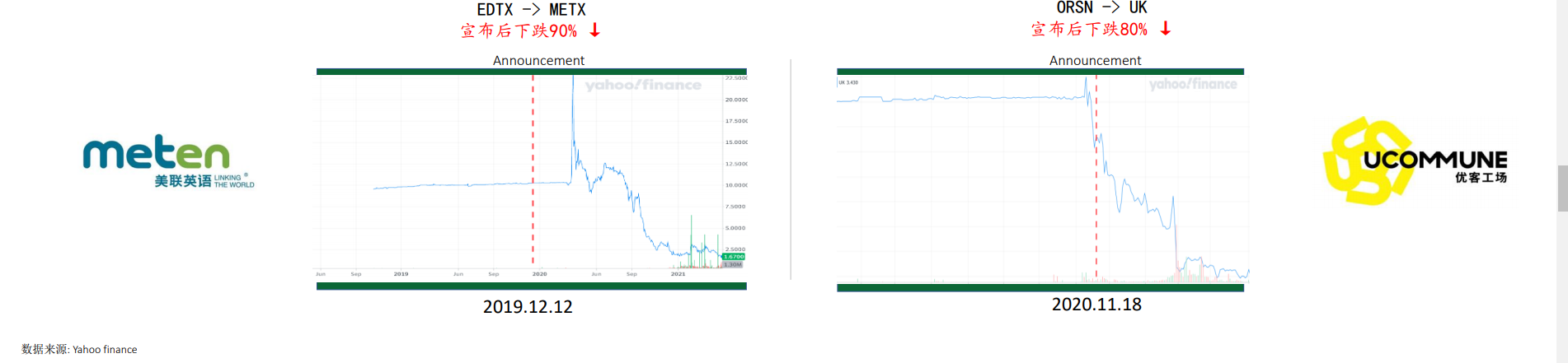 值得一提的是,中国的几家通过SPAC上市的公司,无论是美联英语(METXW.O)、还是优客工场(UKOMW.O),在宣布投资标的即SPAC第二阶段时,股价就严重下跌。其中美联英语再宣布投资标的后股价下挫90%,优客工场宣布投资标的后股价下跌80%。