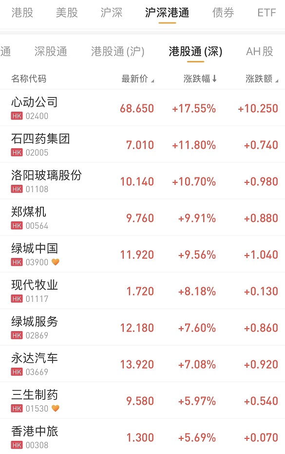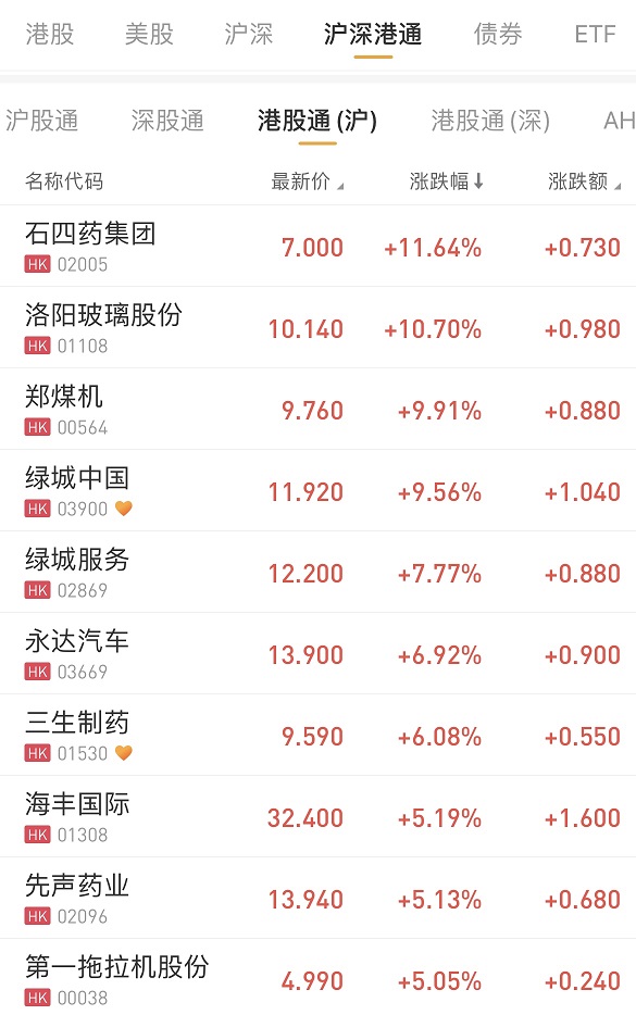 港股通(沪)、港股通(深)个股方面,石四药集团涨11.64%,洛阳玻璃股份涨10.70%,郑煤机、绿城中国涨超9%。