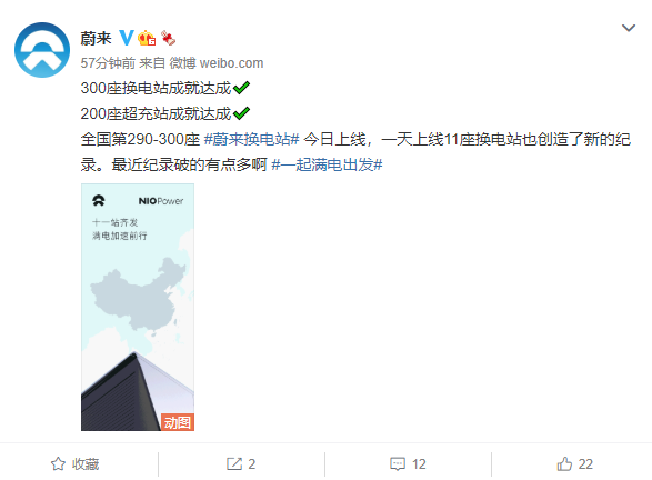 蔚来官方宣布,全国第290-300座蔚来换电站今日上线