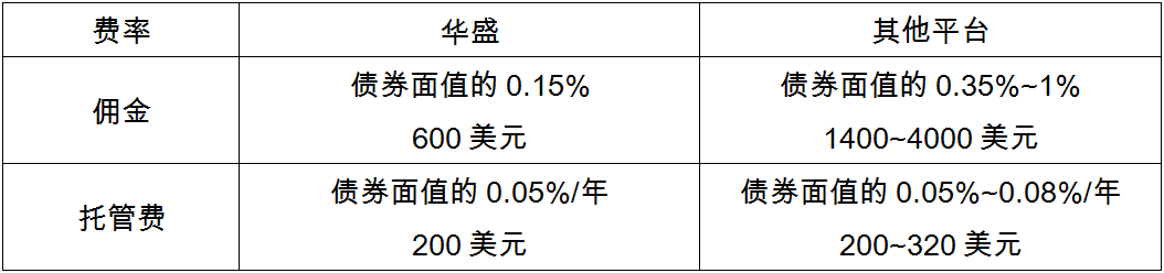 具体差距有多大?举个例子,若债券的买卖价格为100,买入20万美元面值并持有2年卖出,华盛和其他平台所需费用将分别如下: