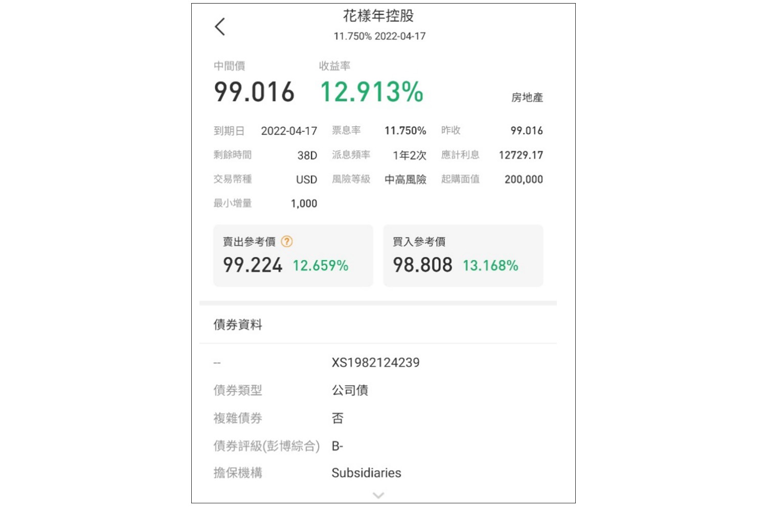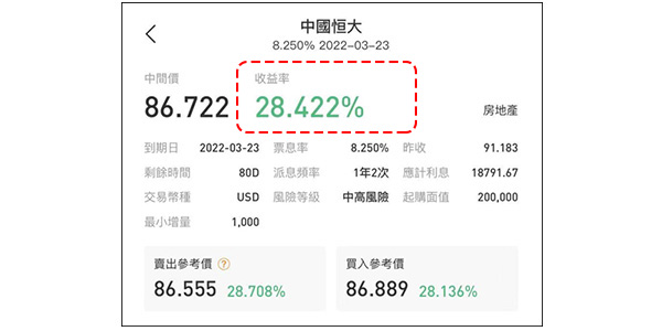 以恒大地产2022年到期的债券(EVERRE 8 1/4 03/23/22)为例,在华盛买入此债券,收益率达28.13%;而在其他平台买入此债券,则只获得27.23%的收益率,相差约0.9%。