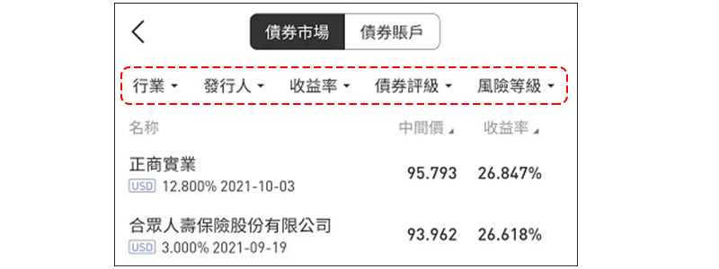 在华盛通债券清单页面,用户可通过行业、发行人、收益率、债券评级、风险等级五大分类筛选心仪的债券(详见图一)。