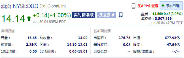 新浪科技讯 北京时间7月1日凌晨消息,滴滴今日正式登陆纽交所,股票代码为“DIDI”,发行价为14美元/ADS。滴滴开盘价为18美元,较发行价上涨28.5%,截止收盘,滴滴股价上涨1.43%,报14.2美元,在随后的盘后交易中,滴滴股价涨超3%,截止北京时间凌晨4:47,滴滴股价在盘后交易中上涨3.03%,报14.56美元。