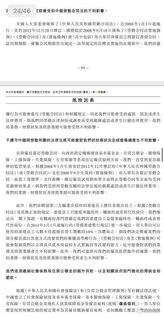此外,奈雪的茶聘请第三方职业介绍所的派遣员工担任茶饮店员工。若其决定解雇部分雇员或以其他方式改变其雇佣或劳动行为,可能须向其雇员提供额外的补偿,其业务、财务状况及经营业绩可能会收到重大不利影响。
