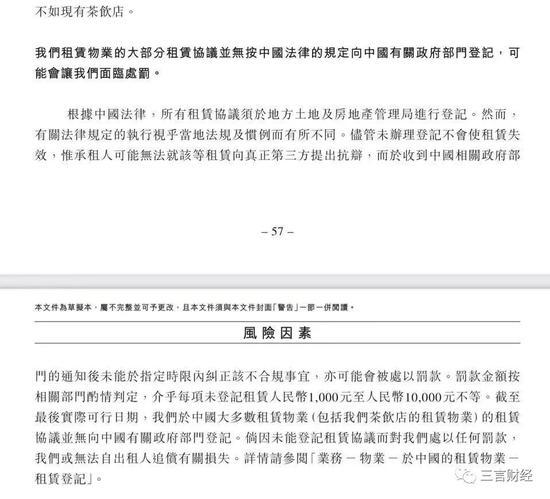 截至最后实际可行日期,奈雪的茶于中国大多数租赁物业的租赁协议并无向有关部门登记。倘因未能登记租赁协议而对我们处以任何罚款,按相关部门酌情判定,介乎每项未登记租赁人民币1000元至人民币10000元不等。