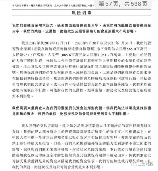 招股书显示,截至2018年及2019年12月31日、2020年9月30日以及2021年1月31日,奈雪的茶的营运资金净额(定义为流动资产总值减流动负资产总额)赤字分别为人民币565百万元、人民币931.3百万元、人民币1085.6百万元及人民币1051.7百万元。