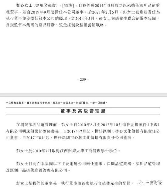 自2014年5月成立深圳品道管理以來担任董事,2014年5月,彭心与赵林联合创办深圳市品道餐饮管理有限公司。彭心负责监督产品研发、质量控制及整体营销战略。