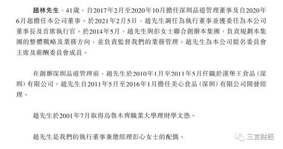 在创办深圳品道管理前,赵林于2010年1月至2011年5月任职于汉堡王食品(深圳)有限公司;2011年5月至2016年1月担任美心食品(深圳)有限公司开发经理。
