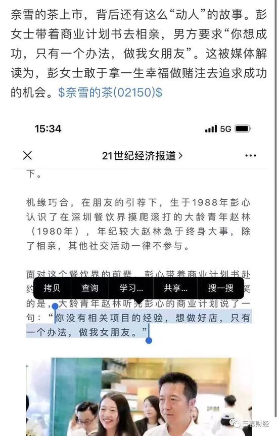 奈雪的茶创始人彭心的网名叫“奈雪”,当她有了做茶的念头后,多方寻求合作者,最终找到了在深圳涉足餐饮界多年的赵林。两人相识三个月以后就领证结婚。