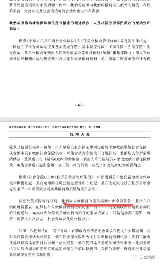 截至最后实际可行日期,奈雪的茶尚未就雇员的雇员福利(社保和公积金)作出全额供款,并已在其财务报表中记录估计欠缴雇员福利金额的应记项目。若其未能在限期内支付欠缴雇员福利供款,或将面临最高达逾期付款金额三倍的罚款。
