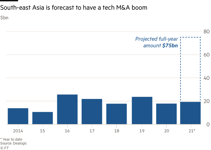 2021年上半年,东南亚科技行业的并购交易规模达到190亿美元,该地区的科技经济“加快了5至10年”,吸引了投资者,这是有史以来最为强劲的上半年表现,主要受到Grab、Gojek和Sea等各大集团的并购活动的推动。专业服务公司安永(EY)驻新加坡合伙人、金融科技专家瓦伦•米塔尔(Varun Mittal)表示,数字银行和贷款是吸引投资者兴趣的主要领域。