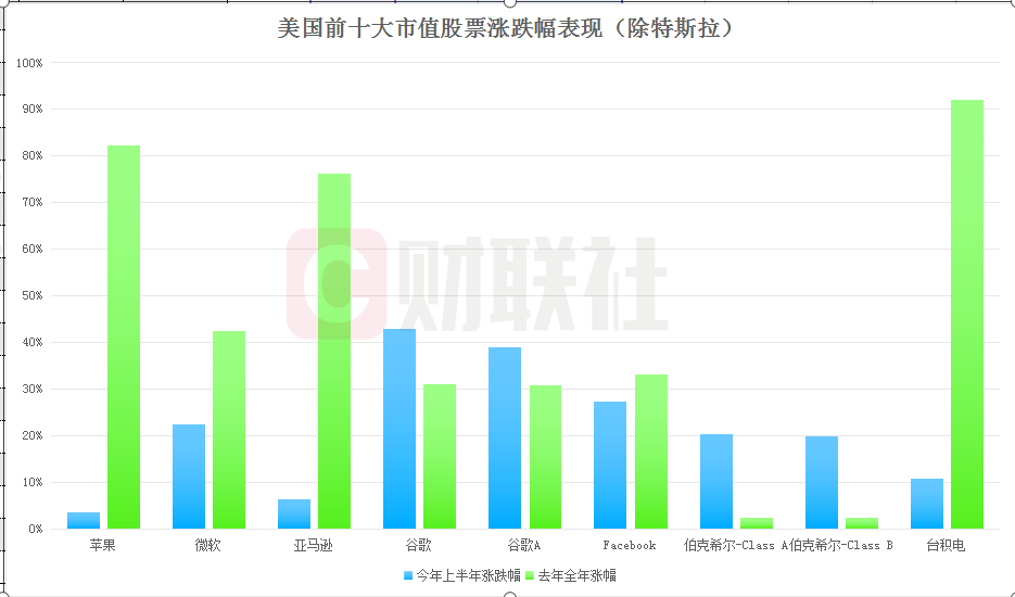 从全美股市值前十大股票来看,市值最大的美股苹果在今年表现平平,仅上涨3.55%。在去年取得743%夸张涨幅的特斯拉,今年也表现不佳,上半年收跌3.68%。