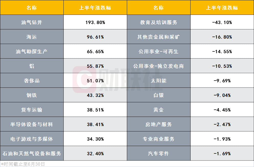 在这一背景下,美股涨幅居前的股票主要被油气、海运、钢铁等板块占据。根据数据显示,上半年美股油气行业板块涨幅在各大主要板块中居首,而在标普500指数成分股中,上半年涨幅最大的前五只股中就有四只是能源股。其中,马拉松石油(MRO)以101%的半年涨幅位居第一。