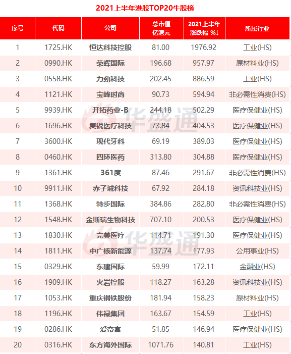 在2021年上半年港股市场涨幅前二十榜单(港股主板、50亿港元市值以上)中涨幅最高的个股是一家叫恒达科技控股的公司,其上半年累计涨幅达到了惊人的1976.92%,也就是近20倍。