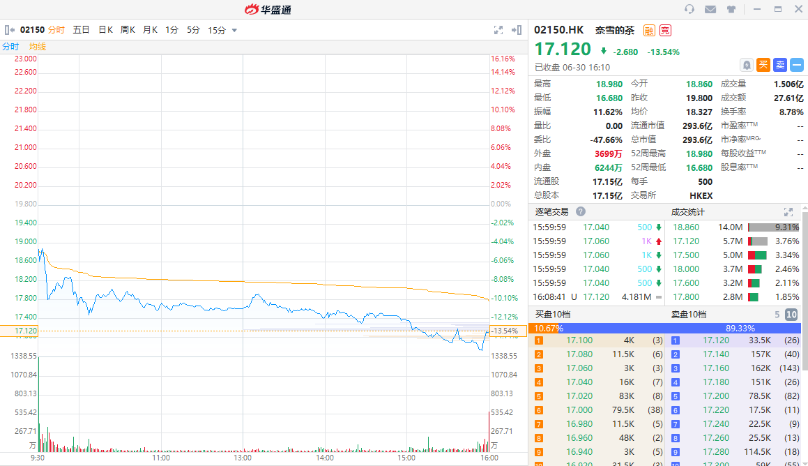 但其上市首日的表现,却让投资者们大跌眼镜。截至6月30日收盘,奈雪的茶下跌13.54%,市值也跌破了300亿港元。