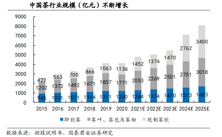 作为茶叶发源地的中国,已有将近5千年的饮茶历史,茶饮品在中国一直广受欢迎。2020年,茶行业市场规模达到了4107亿元,远高于咖啡行业655亿元的规模。而奈雪主营的现制茶行业又是增速最快的,2020年规模已达1136亿元,2015-2020复合年增长率为21.9%。预计2025年市场规模将达到3400亿元,2020-2025年复合增长率达到24.5%。