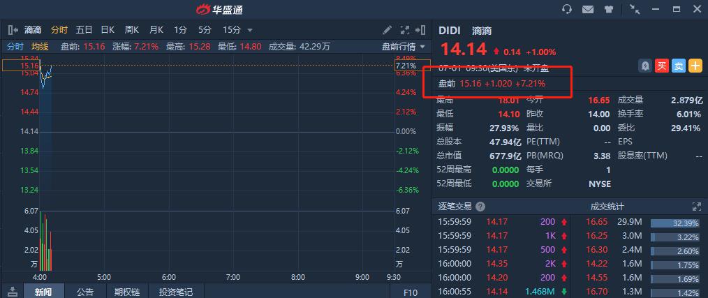 滴滴正式在纽交所挂牌上市,以16.65美元高开,最后收涨1%,报14.14美元,市值达677.93亿美元。因市值达标,富时罗素宣布将滴滴ADR纳入富时罗素全球股票指数、富时罗素全球大型股票指数以及富时罗素新兴市场指数,从2021年7月8日起生效。明晟公司亦宣布,将滴滴ADR加入MSCI中国全股票指数,将从2021年7月15日起生效。
