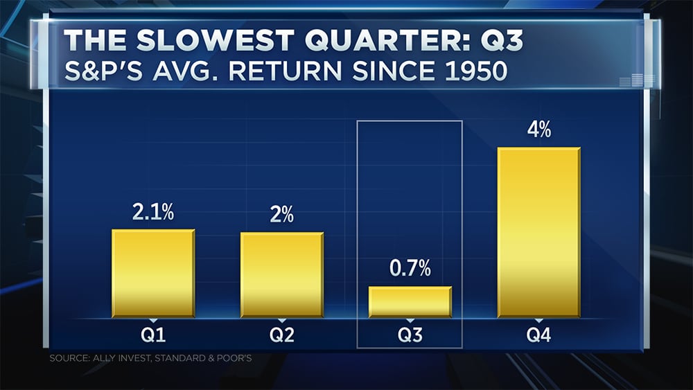 Bell发现,第三季度通常是一年中市场最“疲软”的时期,自1950年以来其平均上涨仅0.7%。