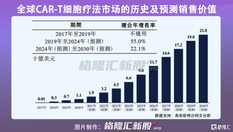 自2017年首批两个CAR-T产品获批以来,全球CAR-T市场一直在迅速扩大。按销售价值计,全球CAR-T市场规模已从2017年的0.1亿美元增长到2019年的7亿美元,预计全球CAR-T细胞疗法市场的销售价值达至2024年的66亿美元,2019年至2024年的复合年增长率为55.0%。截至2030年,按销售价值计,全球CAR-T市场规模预计达至218亿美元,2024年至2030年的复合年增长率为22.1%。