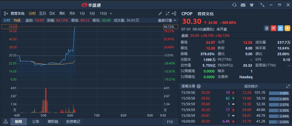 华盛资讯7月1日讯,“中国嘻哈第一股”普普文化(CPOP.US)上市次盘前一度涨近100%。此前,普普文化首日大涨405%,报30.30美元,盘中一共触发了多达七次熔断。