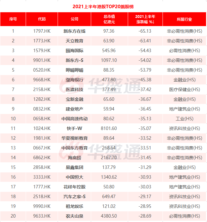 在2021年上半年港股市场跌幅前二十榜单(港股主板、50亿港元市值以上)中跌幅最大的个股是新东方在线。