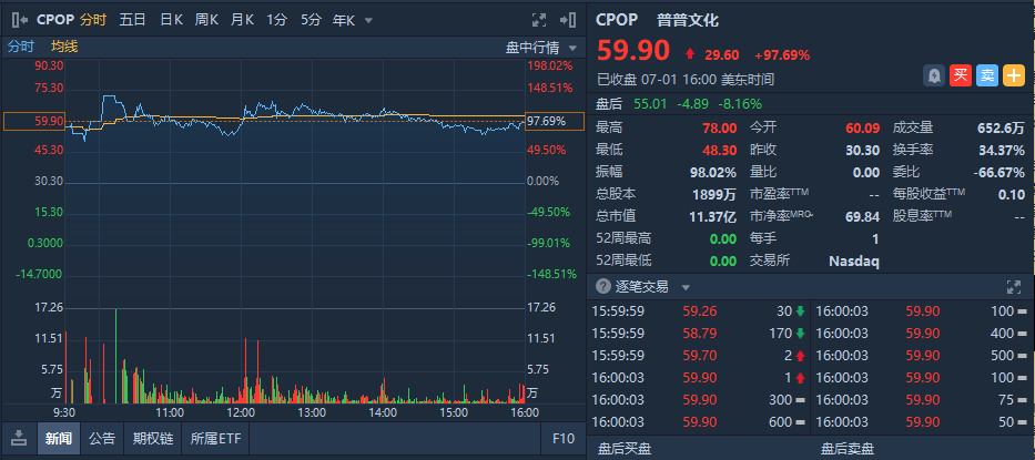 次新股周四再度飙涨,截至收盘该股涨97.69%。该股昨日上市首日大涨405%,盘中七度触发临时停牌。上市仅仅两天,普普文化已经猛涨898%。普普文化成立于2007年,公司位于中国厦门,以嘻哈文化的价值为核心,主营嘻哈文化内容运营,包括在线嘻哈节目运营、活动赛事举办及相关培训等。此外,公司还为企业客户提供活动策划和执行服务以及营销服务。